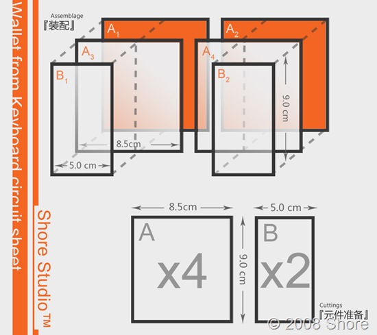 废旧键盘打开之后里面有三张透明的电路膜,现在叫大家用这个东西制作钱包。这个方法是从国外的某网站看到的。原来的设计是针对美元设计的,美元比较细长,做出的钱包装不下人民币。因此本人根据实际情况进行了本地化的重新设计。