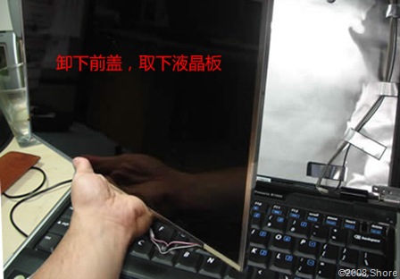 这个DIY过程是比较危险的,LCD的电路有高压部分。不过还好上面都有标识,打开自己就能看见了。另外笔记本的塑料外壳切割之后必然带来强度下降。从此之后就要小心使用本本了。像我不甚疏忽,将本本的上盖弄坏了一部分(贴白胶带处),很可惜。大家自己做的时候一定要小心哦。
