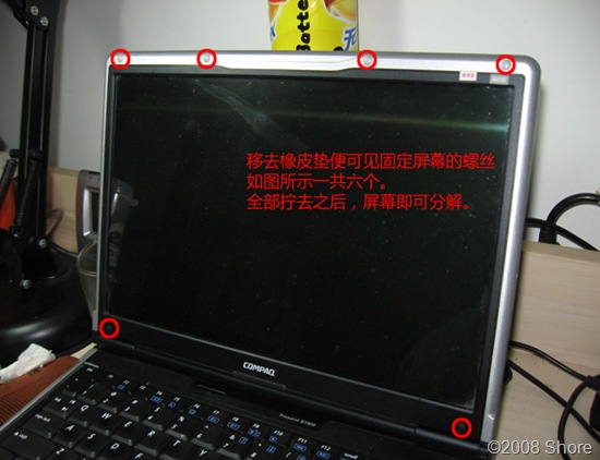首先,如上图,就是用锥子将显示器表面的六个胶垫取下,露出里面的螺丝,将他们统统拧下来。这样,固定LCD的前面板框架就能拆下来了。